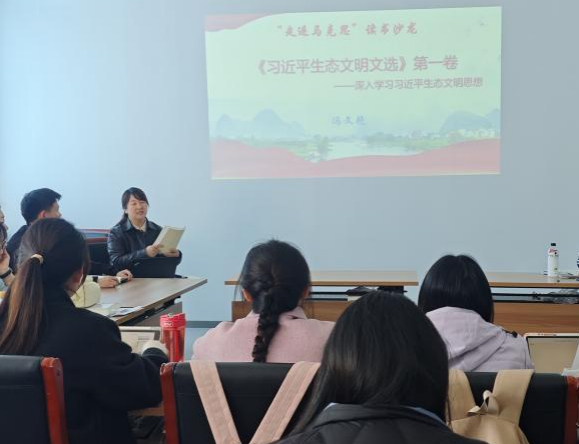 本次研读书目为《习近平生态文明文选》第一卷。活动中,冯文艳教授从内容概述、核心思想、重大意义三个维度,对《习近平生态文明文选》第一卷进行系统讲解。冯文艳教授首先介绍了《习近平生态文明文选》第一卷的出版背景、篇章结构与内容主旨,强调其系统反映了习近平生态文明思想的丰富内涵、科学体系和原创性贡献,引导同学们深入思考。随后围绕习近平生态文明思想的“十个坚持”,结合重点文本深入解读其核心要义,与同学们共同研读并开展互动交流。最后,引导同学们深刻领悟《习近平生态文明文选》第一卷的历史性贡献和重大意义,勉励同学们勤学善思、深悟原文,不断提升认知水平。