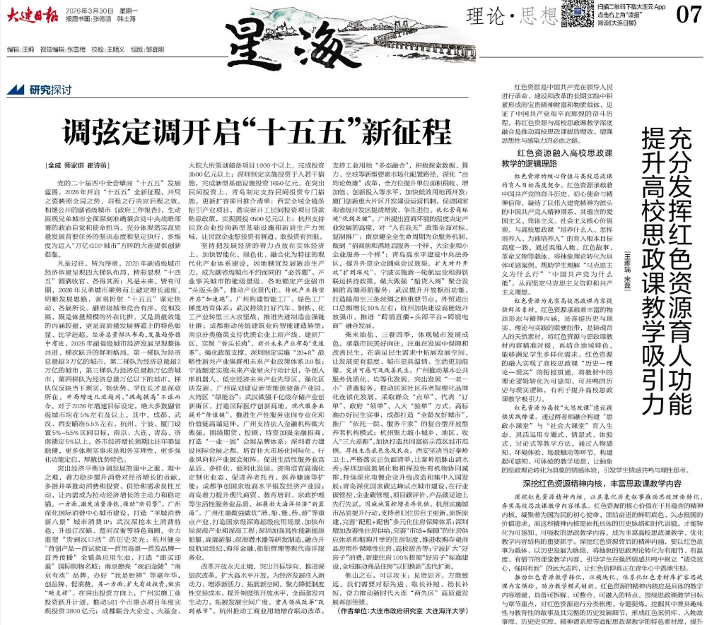 3月30日,《大连日报》理论版刊发大连市政府研究室与我校马克思主义学院研究生共同署名文章《调弦定调开启“十五五”新征程》,署名作者师家琪、崔诗萌为我校马克思主义学院2024级研究生。